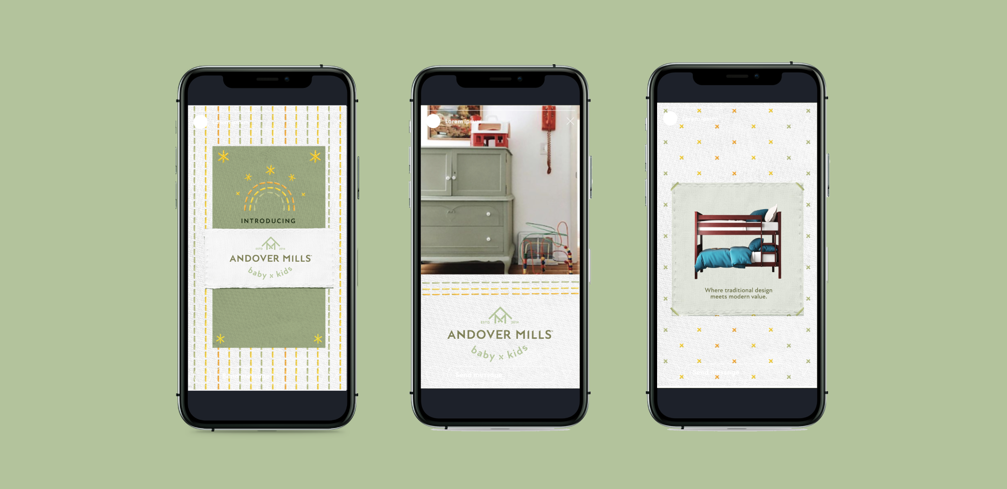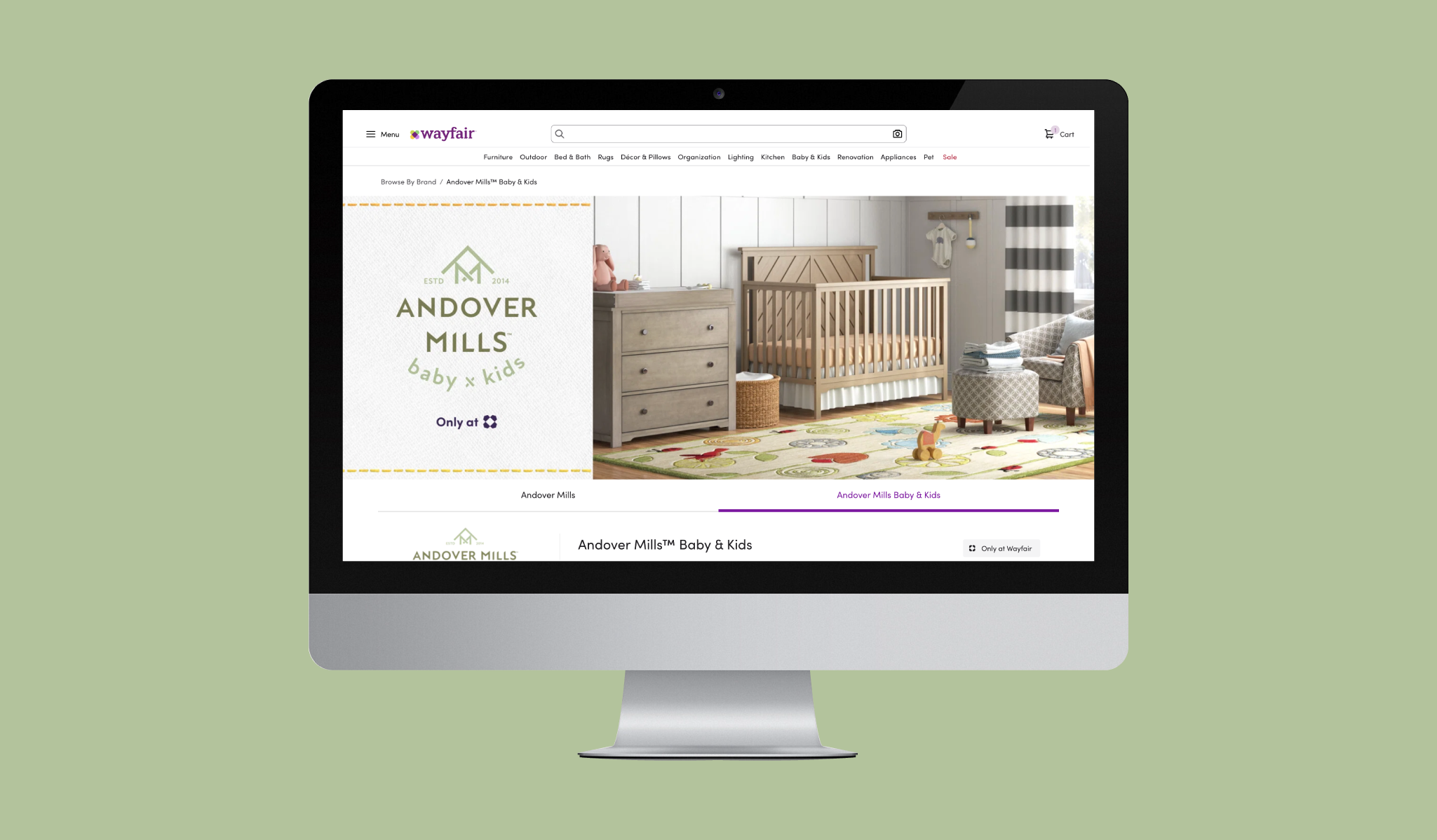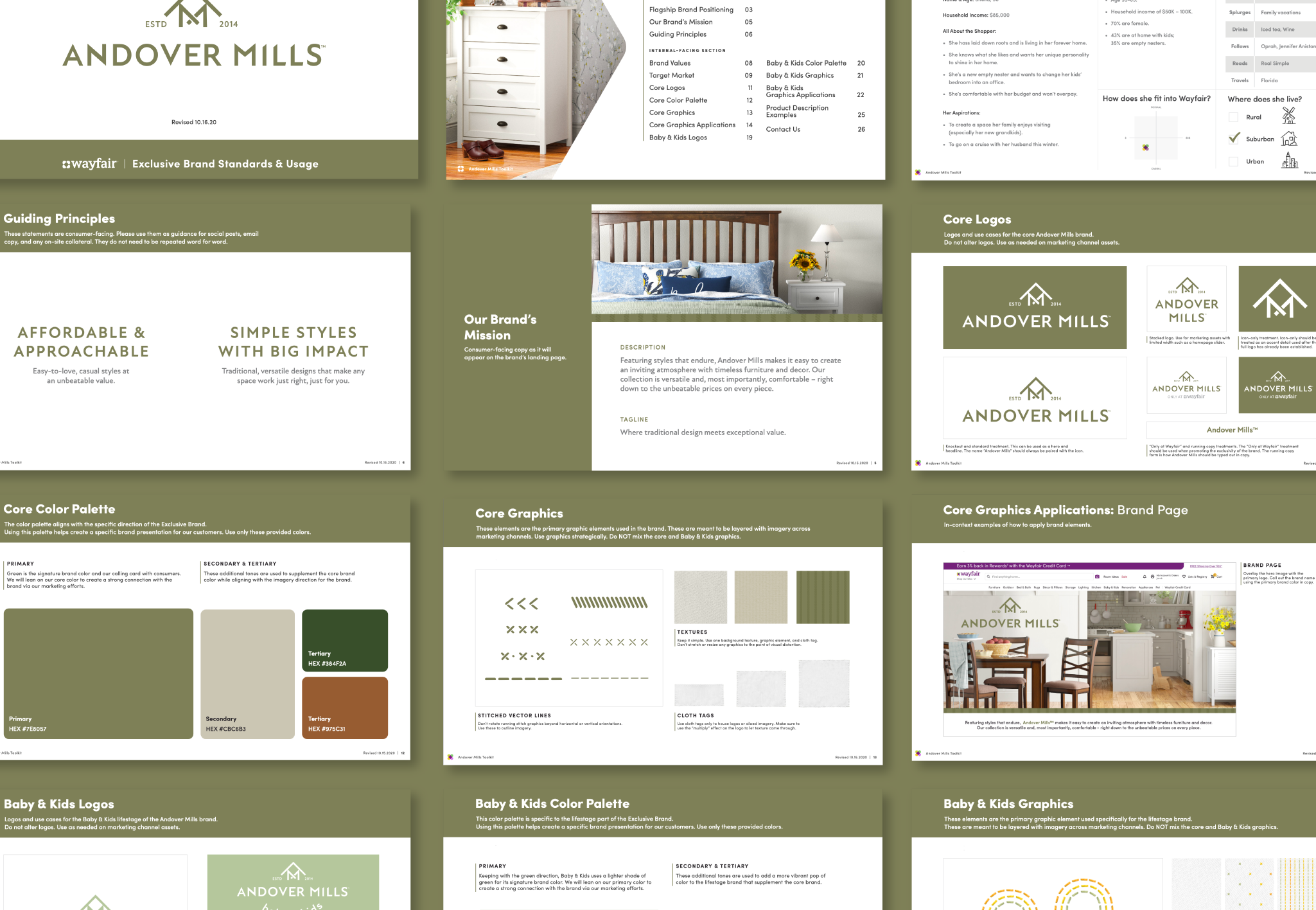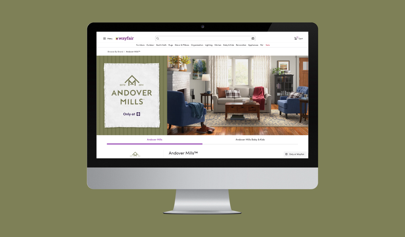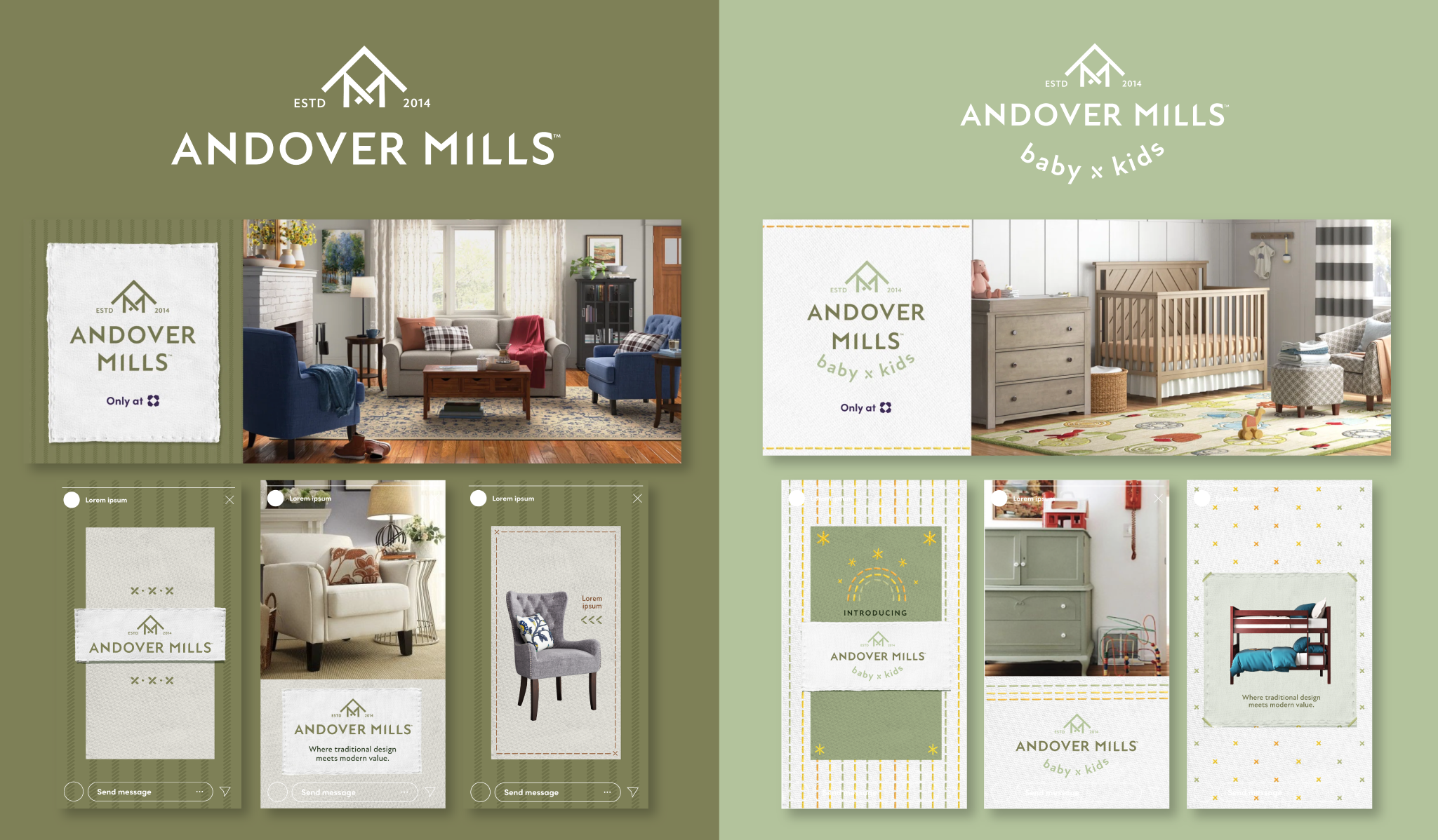 Project Details: Andover Mills™ is one of Wayfair’s top-performing exclusive brands, selling a range of affordably-priced traditional home goods. The team was tasked with refreshing the Andover Mills™ visual identity, while still retaining its traditional feel. We created a new brand identity system for use across online channels. Using earthy, neutral tones, custom typographical treatments, and warm, textile-inspired textures, we created a consistent visual identity that appeals to our target consumer across channels. The brand, as well at its Baby & Kids division, feels distinct and unique within a mass retail brand, and creates a memorable experience for consumers.