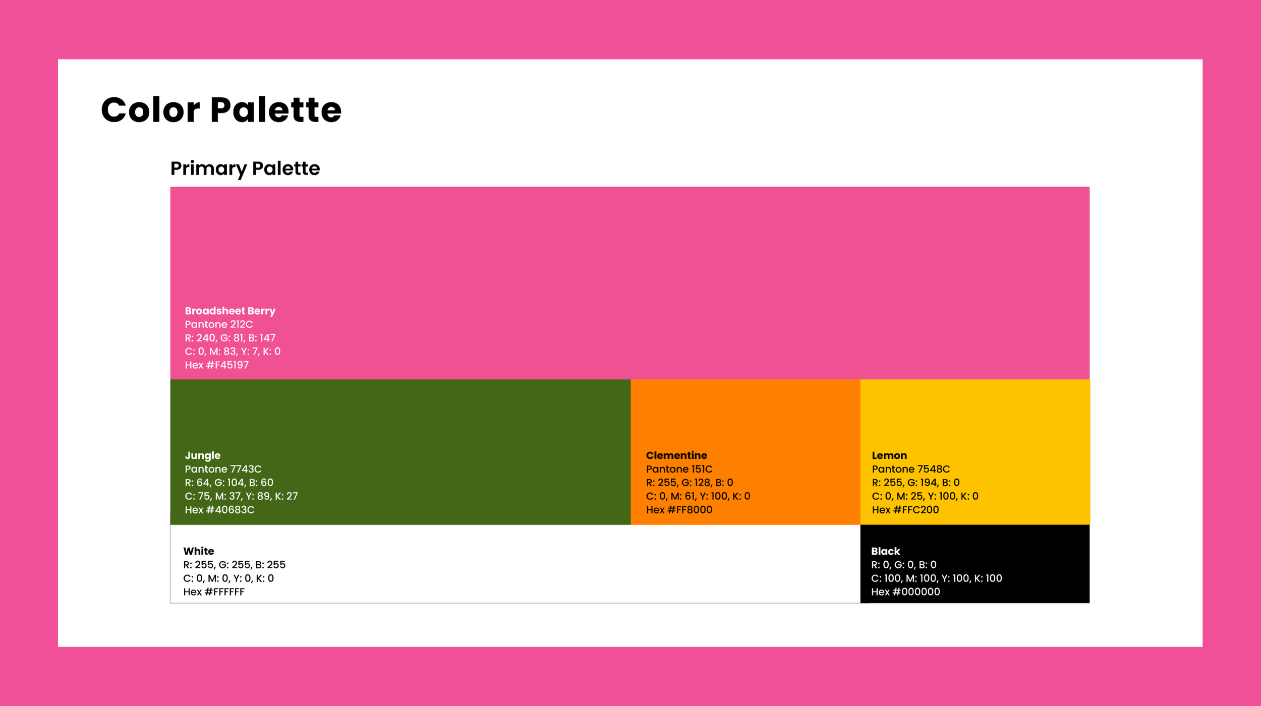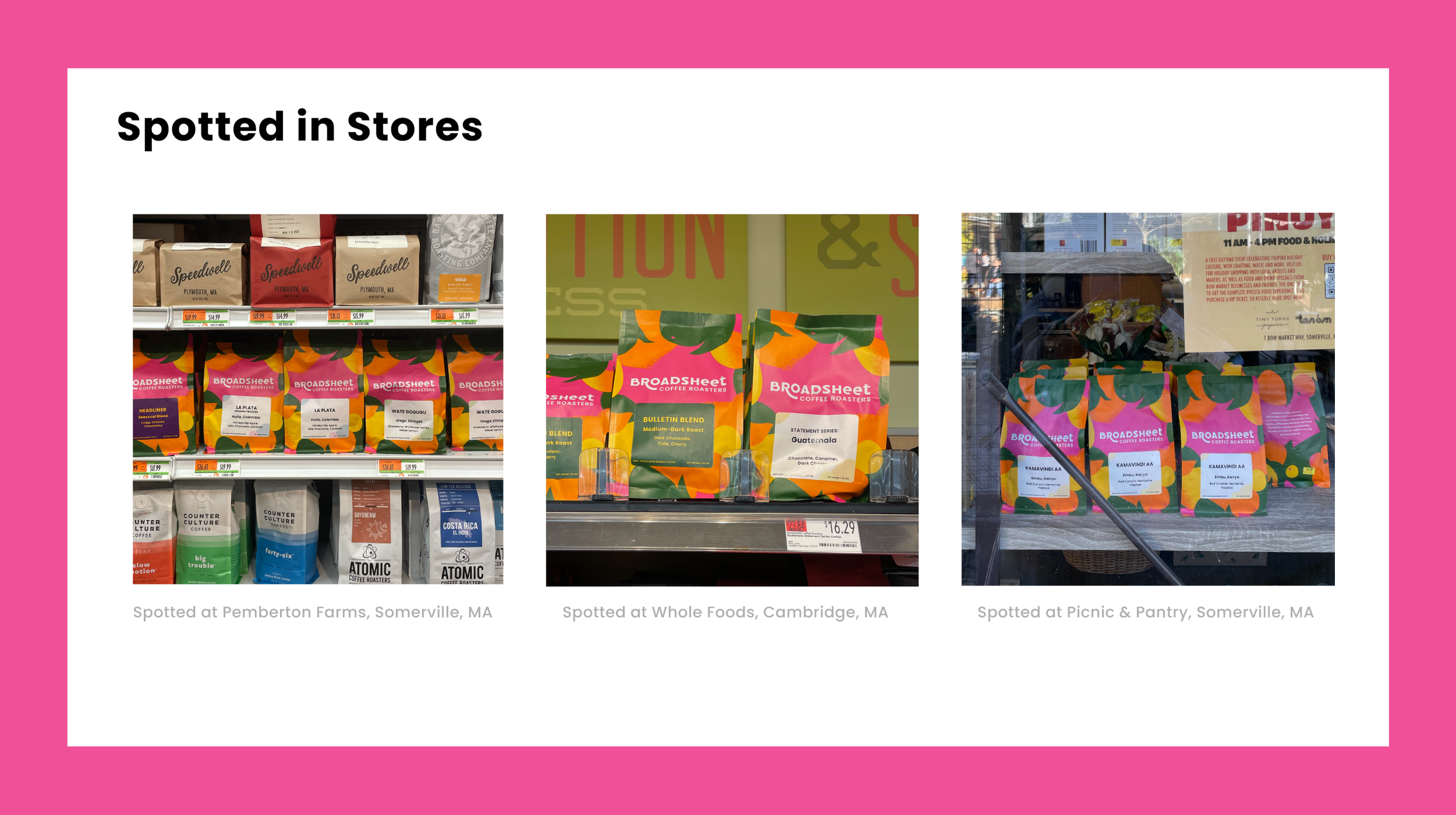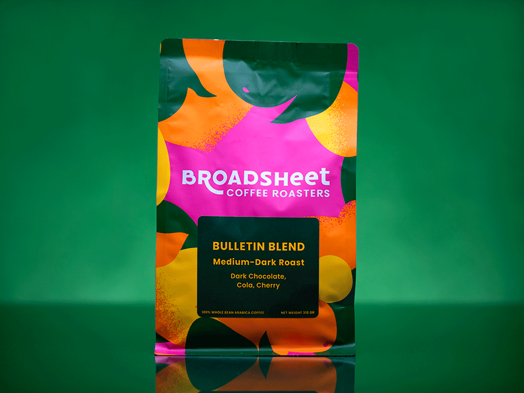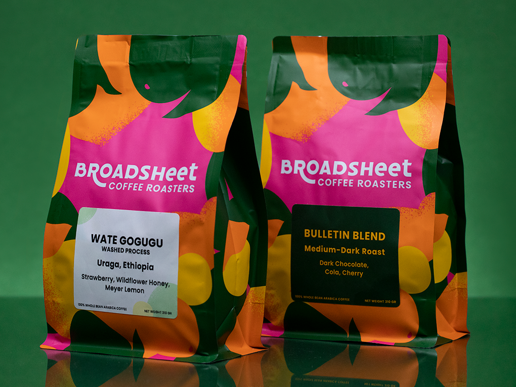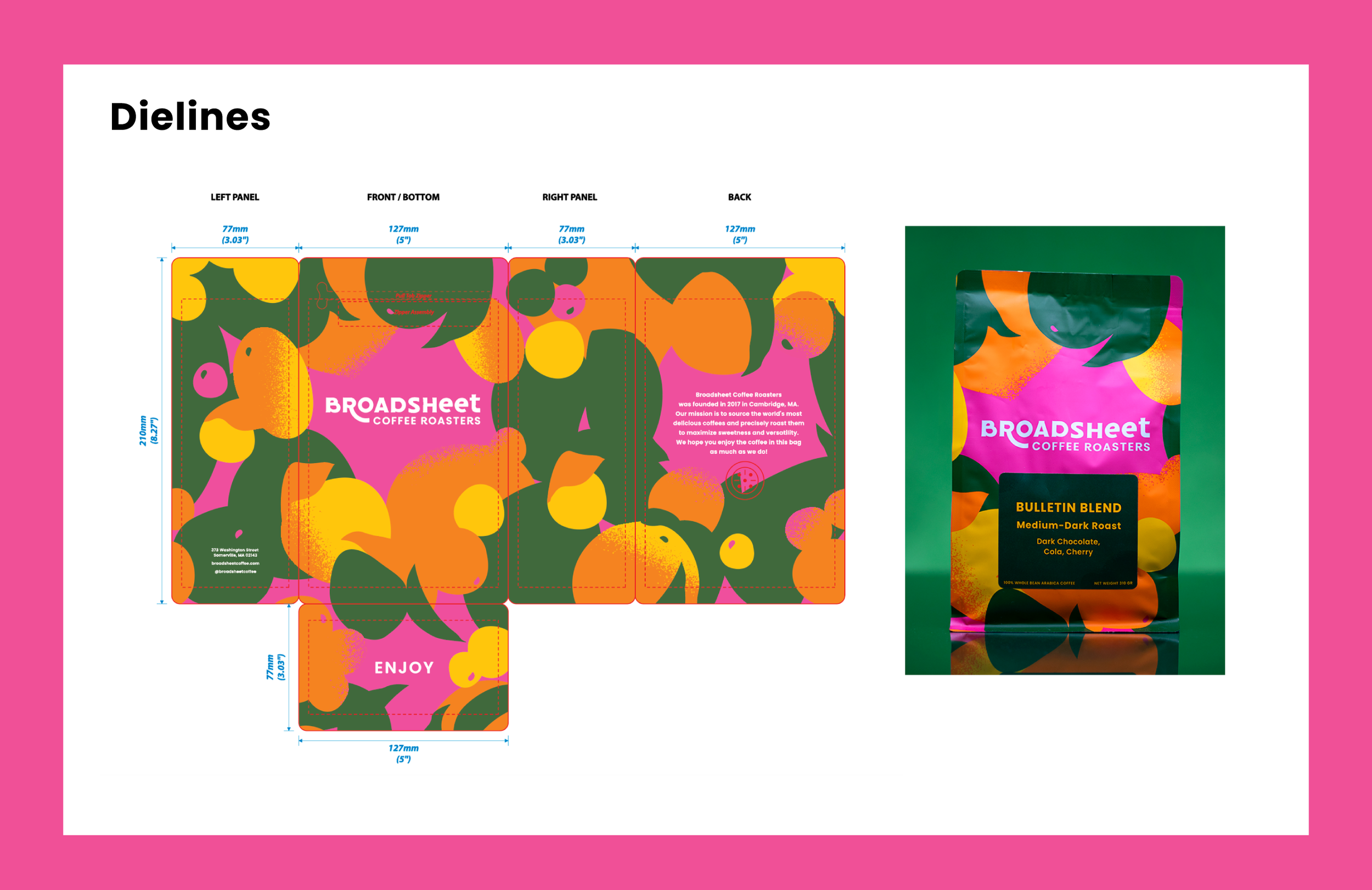 Project Details: Broadsheet Coffee Roasters is a small coffee roastery and coffee shop based in Cambridge, MA. Broadsheet specializes in making coffee that embraces fruity flavor. This sets them apart from competitors, so the team came to me to design a new brand identity for them to reflect these values. I developed a new logo, color palette, and pattern design using saturated colors, bold typography, and fruit illustrations on their coffee bags, coffee cups, and more. Since the completion of the project, Broadsheet’s coffee bags have drawn in casual coffee drinkers and connoisseurs alike, and can be spotted across Boston-area specialty grocers and cafes.