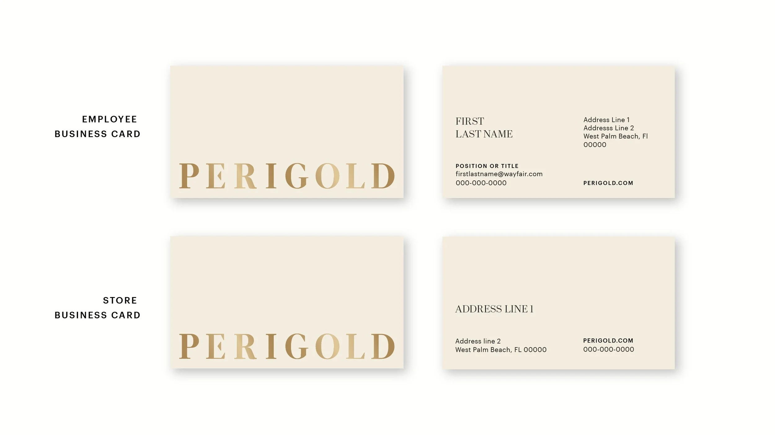 Project Details: Perigold is a luxury home retail brand under the Wayfair family of brands, with a focus on offering high-end, designer home goods. For Perigold’s first ever brick and mortar store, I created conceptual mockups of printed goods customers can carry out of the store: business cards, gift cards, and gift card holder with envelope. These elements embody the luxe tone of the Perigold brand, focusing on a refined color palette with high-end print treatments like reflective gold effects, ultra thick paper stock, and embossed copy.
