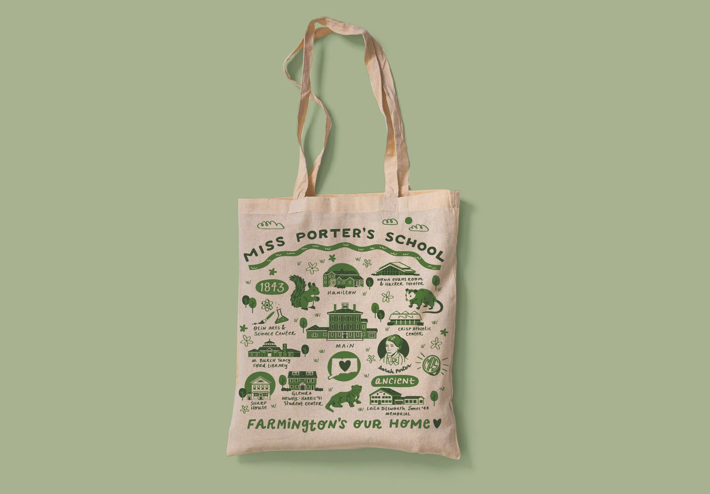 Project Details: Miss Porter’s School is a private, all-girls high school in Connecticut. The client wanted to an illustrated map of Miss Porter’s campus to use on totebags to give away at an alumni event. I designed the map to feature key campus landmarks, if-you-know-you-know Miss Porter’s easter eggs, and nods to Miss Porter’s history. The artwork was created in two colors to be compatible with silkscreening on the totebags and measures 15”Wx16”H.