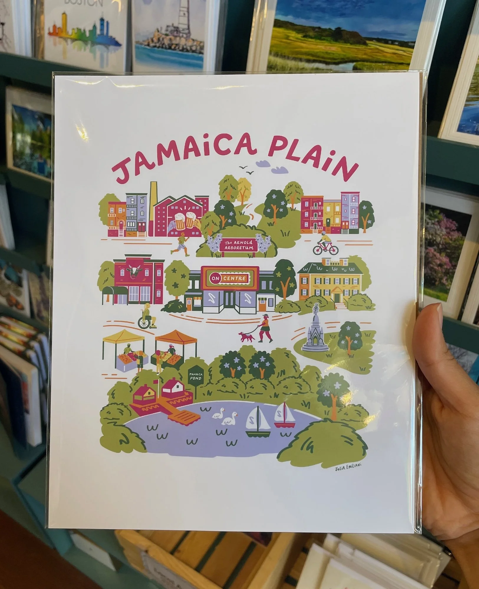 Project Details: On Centre is a small busiiness based in Jamaica Plain, MA that sells home goods, gifts, and accessories. Most On Centre shoppers are based in and around Jamaica Plain and love their neighborhood. As such, the team and I collaborated on a map illustration to be sold at On Centre in various applications, celebrating the unique landmarks and culture of the neighborhood. I illustrated local, popular landmarks like Jamaica Pond and the Arnold Arboretum, included a nod to the On Centre shop location, and included the diverse community sprinkled throughout the artwork, providing a unique, hyper-local artwork for On Centre customers. The finished illustration is a 6 color design designed to adapt to various applications like totebags and art prints.
